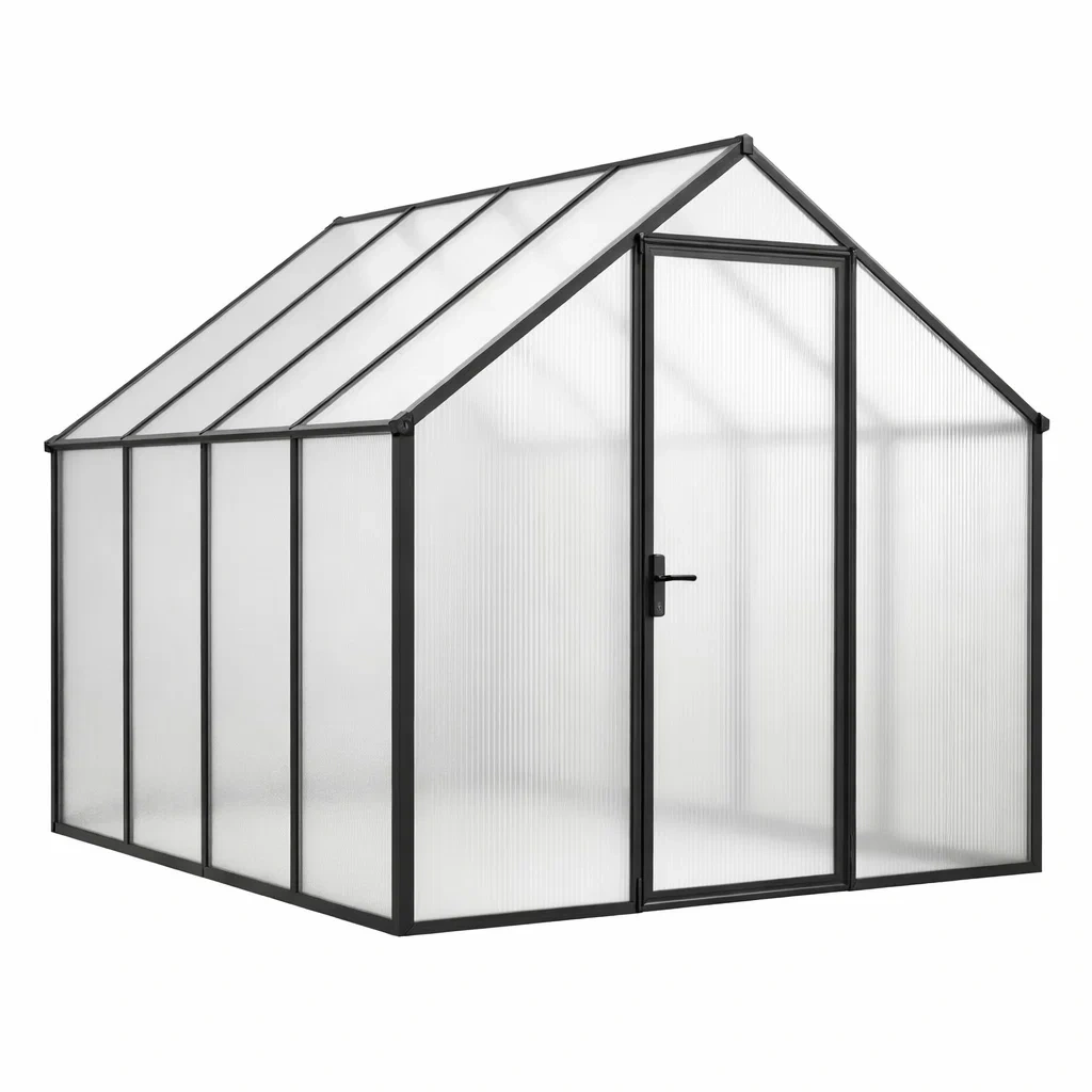Das Gewächshaus besteht aus 4 mm dicken Polycarbonatplatten und einem stabilen Aluminiumrahmen. Es bietet gute Isolierung und UV-Beständigkeit. Die Abmessungen sind 250 cm Länge, 190 cm Breite und 195 cm Höhe. Regelmäßige Reinigung wird empfohlen, schwere Schneelasten sollten vermieden werden.